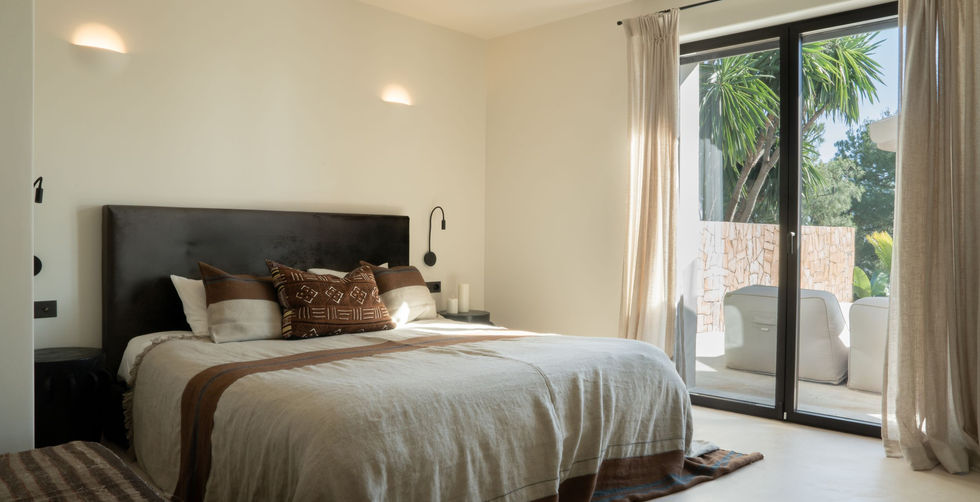 The villa features 5 spacious en-suite bedrooms across two levels. The master suite occupies the entire upper floor and includes a private terrace with sun loungers, an outdoor shower, a spectacular dressing room, and a luxurious bathroom with bath and shower.